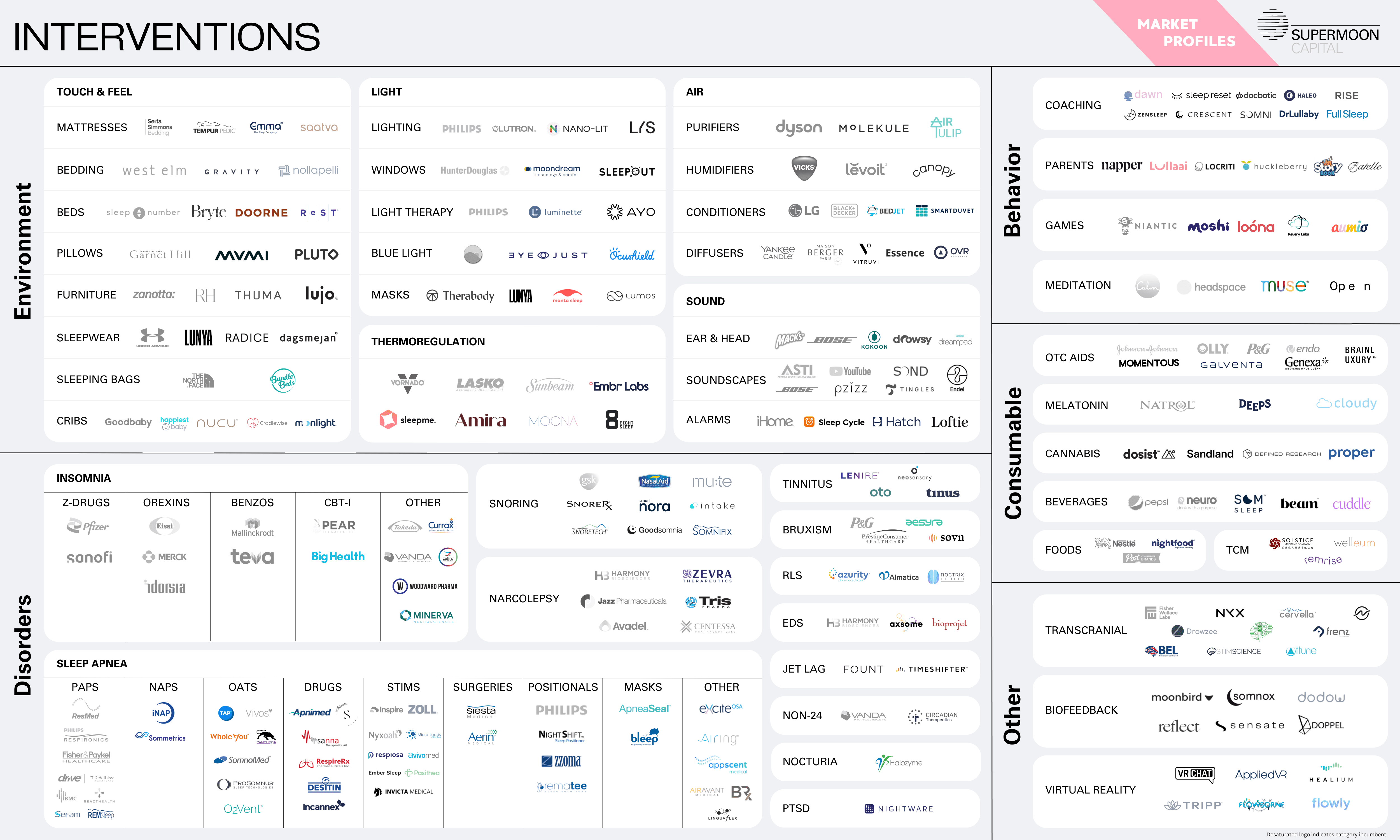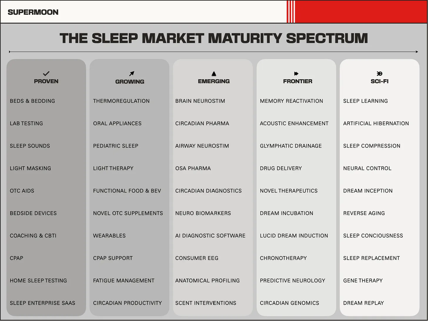 A deep dive into 50 segments of the sleep market from proven, mature categories to paradigm-shifting, moonshot ideas.